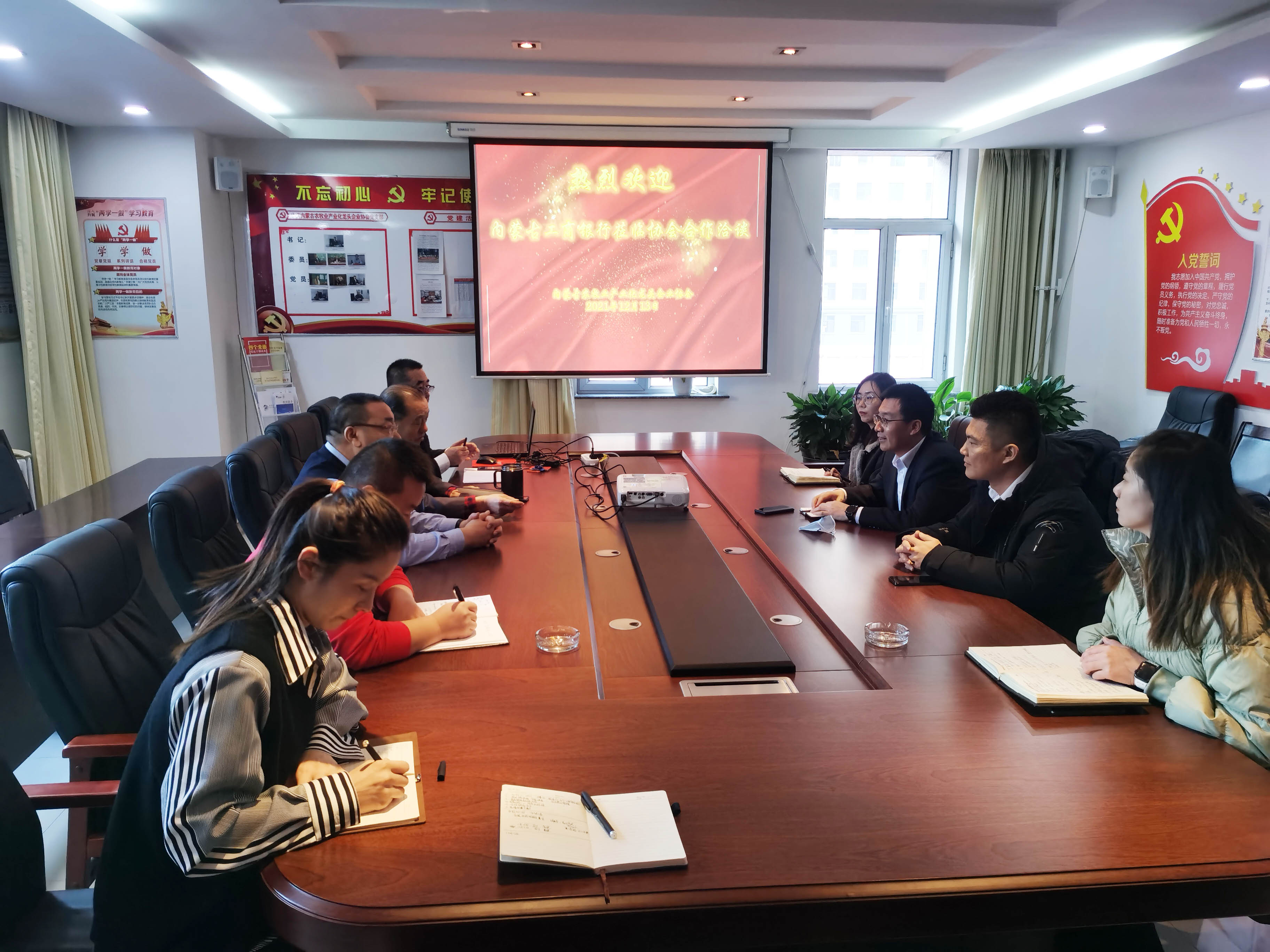 2021年12月13日,工商銀行內蒙古分行普惠金融事業(yè)部總經理(鄉(xiāng)村振興辦公室主任)王清亮一行5人到內蒙古農牧業(yè)產業(yè)化龍頭企業(yè)協(xié)會進行合作洽談,協(xié)會會長周勇、執(zhí)行會長林永亮、執(zhí)行秘書長呼群等參加會議。