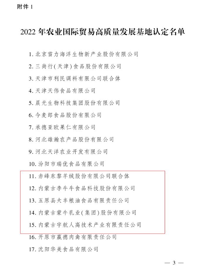 8月29日,農(nóng)業(yè)農(nóng)村部辦公廳印發(fā)《關(guān)于認定2022年農(nóng)業(yè)國際貿(mào)易高質(zhì)量發(fā)展基地的通知》,認定116個基地為2022年農(nóng)業(yè)國際貿(mào)易高質(zhì)量發(fā)展基地,其中,內(nèi)蒙古5家企業(yè)上榜。
