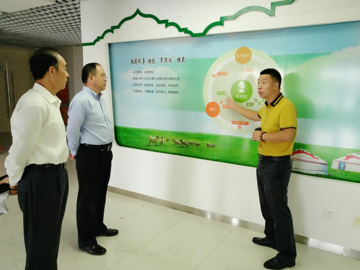 調(diào)研組一行首先參觀協(xié)會會長單位羊牧業(yè)股份有限公司,在聽取協(xié)會會長、蒙羊牧業(yè)副董事長閆樹春的介紹后,調(diào)研組一行詳細(xì)了解了蒙羊的“生產(chǎn)鏈”和“羊聯(lián)體”模式,并指出“羊聯(lián)體”模式是一種很好的模式,企業(yè)發(fā)展帶動農(nóng)牧戶致富,并由企業(yè)出資擔(dān)保農(nóng)牧戶,降低銀行、保險的風(fēng)險,這種模式既新穎又可控風(fēng)險。調(diào)研組一行表示,今后銀行等各類金融機構(gòu)可以加大參與力度,讓金融資本更大程度上的支持內(nèi)蒙古農(nóng)牧業(yè)發(fā)展。