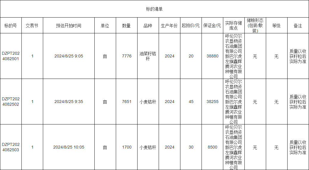 轉(zhuǎn)讓標(biāo)的為油菜籽秸稈、小麥秸稈、小麥秸稈,涉及面積油菜籽秸稈7776畝、小麥秸稈7651畝、小麥秸稈1700畝,意向受讓方在競(jìng)買前應(yīng)自行對(duì)標(biāo)的預(yù)估數(shù)量和質(zhì)量情況進(jìn)行充分了解,交易標(biāo)的均以實(shí)際狀況為準(zhǔn)。標(biāo)的存放地位于呼倫貝爾農(nóng)墾物資石油集團(tuán)有限公司新巴爾虎左旗鑫輝騰河農(nóng)業(yè)種植有限公司,詳情見(jiàn)標(biāo)的清單: