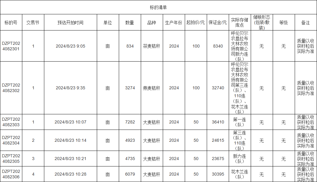 轉(zhuǎn)讓標的為莜麥秸稈、燕麥秸稈、大麥秸稈,涉及面積莜麥秸稈834畝、燕麥秸稈3274畝、大麥秸稈(1-4標)分別為7282畝、4923畝、4735畝、6079畝,意向受讓方在競買前應自行對標的預估數(shù)量和質(zhì)量情況進行充分了解,交易標的均以實際狀況為準。標的存放地位于呼倫貝爾農(nóng)墾拉布大林農(nóng)牧場有限公司,詳情見標的清單: