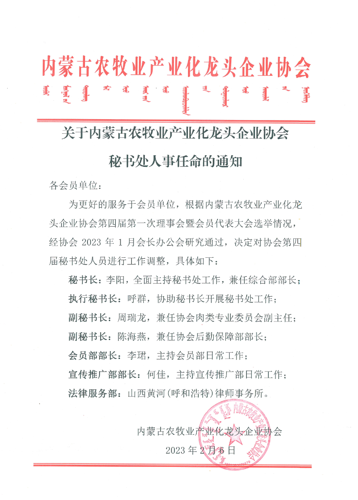 關(guān)于內(nèi)蒙古農(nóng)牧業(yè)產(chǎn)業(yè)化龍頭企業(yè)協(xié)會秘書處人事任命的通知