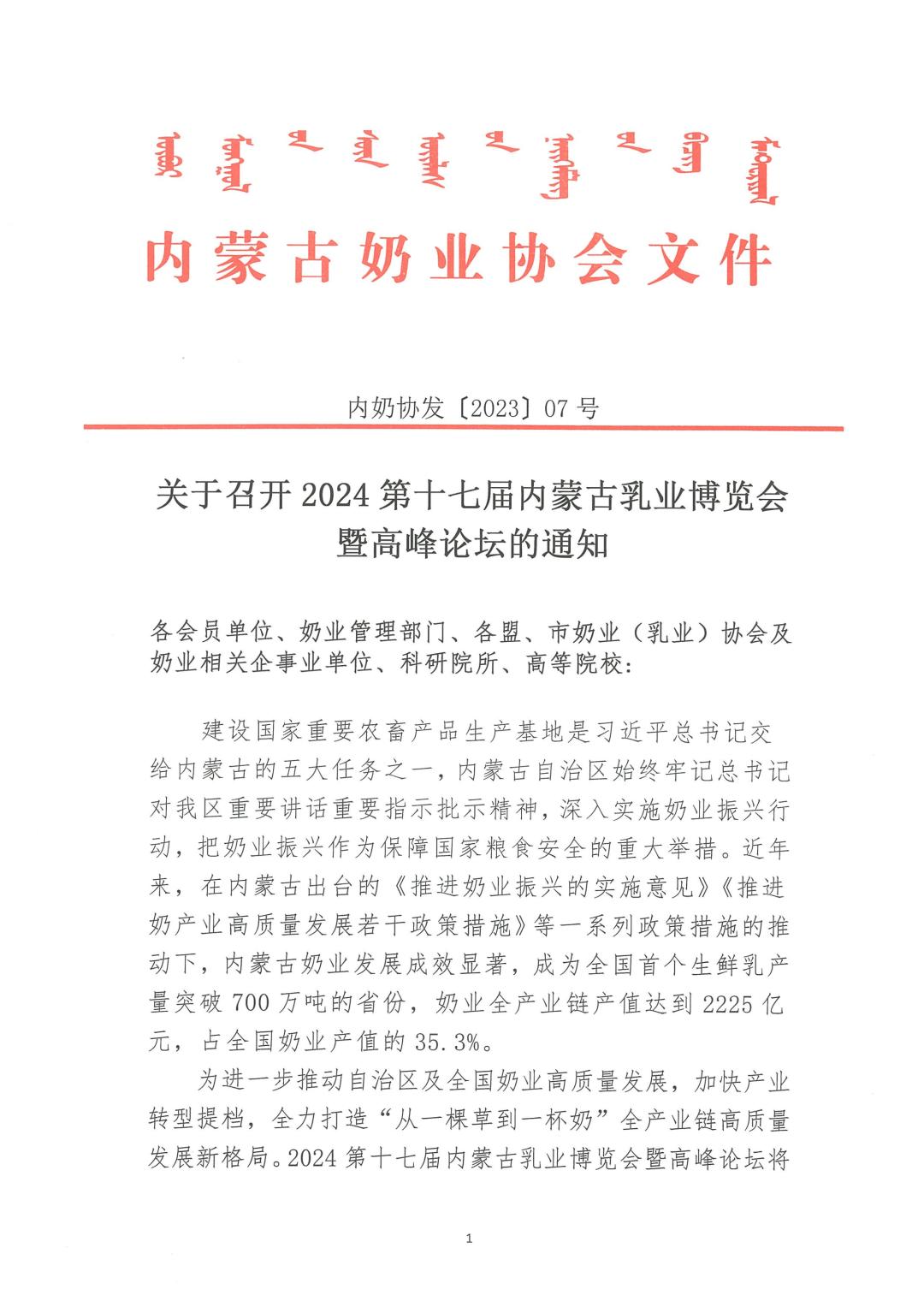 轉(zhuǎn)發(fā):關(guān)于召開2024第十七屆內(nèi)蒙古乳業(yè)博覽會暨高峰論壇的通知