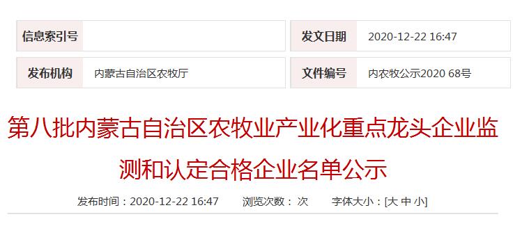 企業(yè)名稱:第八批內(nèi)蒙古自治區(qū)農(nóng)牧業(yè)產(chǎn)業(yè)化重點(diǎn)龍頭企業(yè)監(jiān)測和認(rèn)定合格企業(yè)名單公示