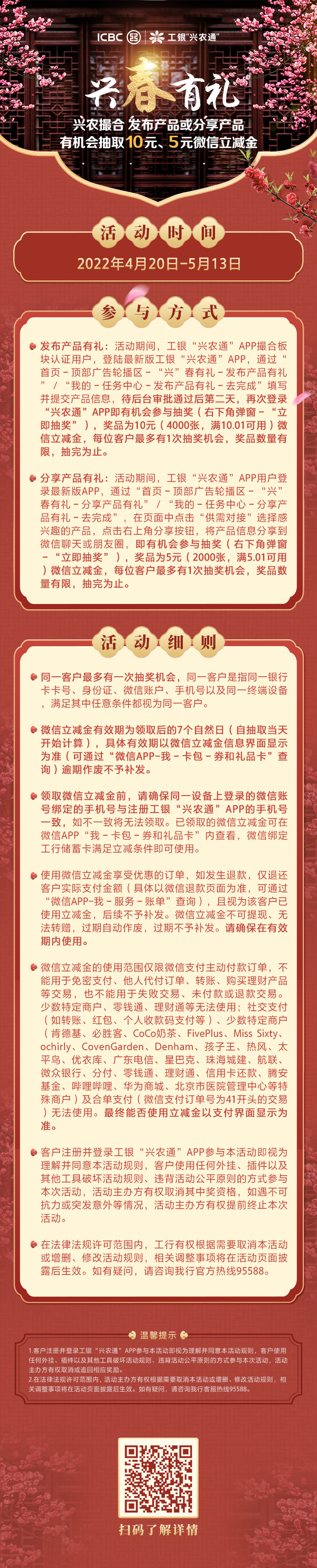 近期,“興農(nóng)撮合”平臺正式入駐工銀“興農(nóng)通”APP,還上線了“興”春有禮營銷活動。入駐平臺后,發(fā)布并分享產(chǎn)品,最高有機會獲得15元微信立減金!詳情可參考下方長圖: